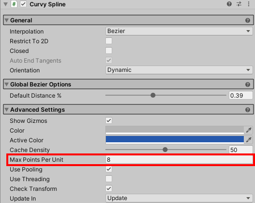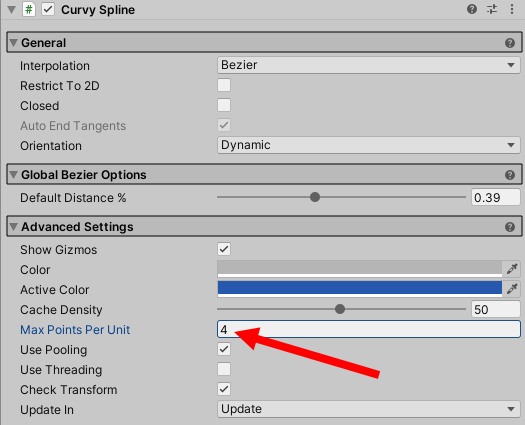 16)스플라인의 advanced settings에서 max points per unit 수치를 조절하여 포인트와 포인트 사이의 최대 샘플링 포인트의 개수를 설정할수있다.