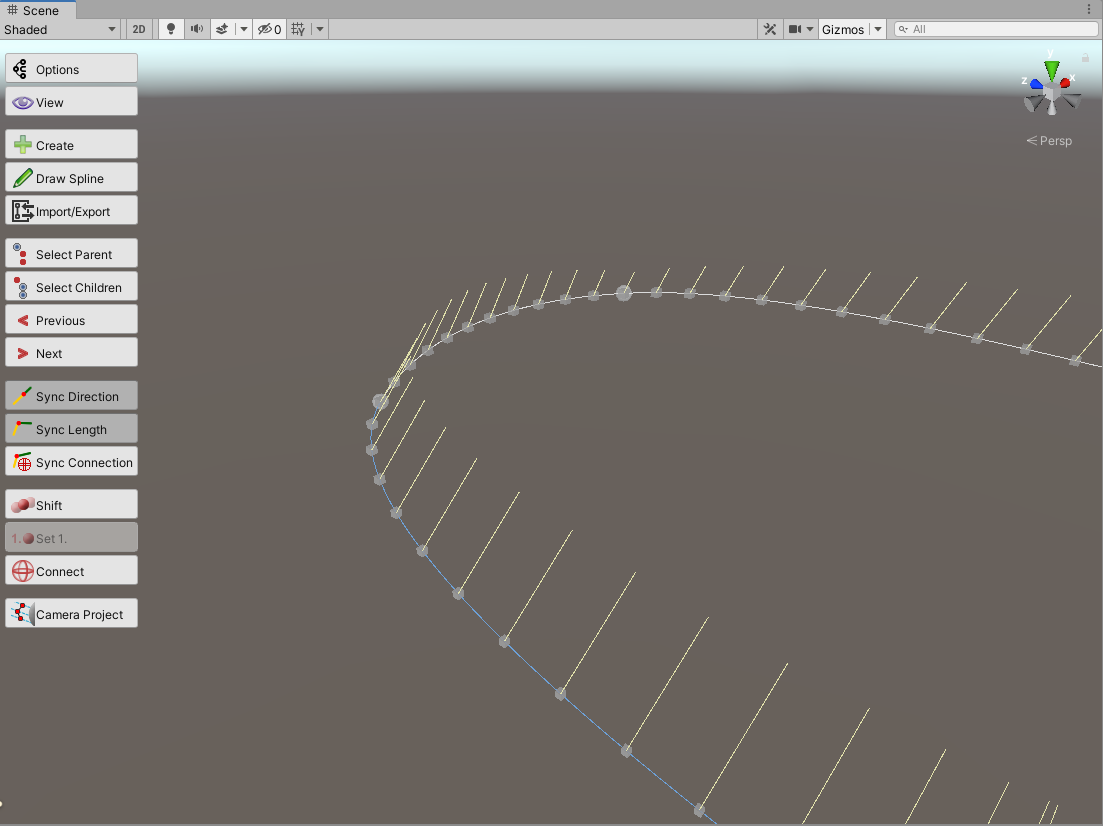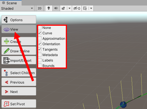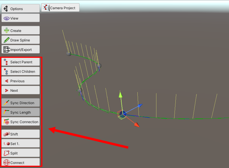 9)스플라인 및 포인트 오브젝트를 선택하면 scene view의 좌측에서 해당 오브젝트에 대하여 사용할수있는 도구들을 표시한다.