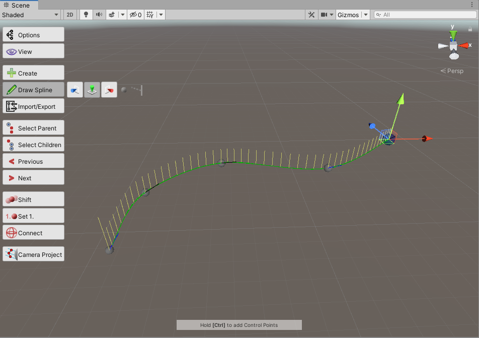 3)씬에서 ctrl+좌클릭으로 포인트를 추가하여 스플라인을 생성한다. xz평면을 활성화하였기때문에 포인트의 y값이 0을 가지는 스플라인을 생성하였다.