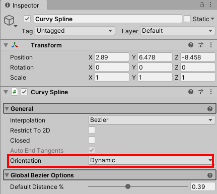 12)curvy spline 컴포넌트에서 orientation을 선택한다.