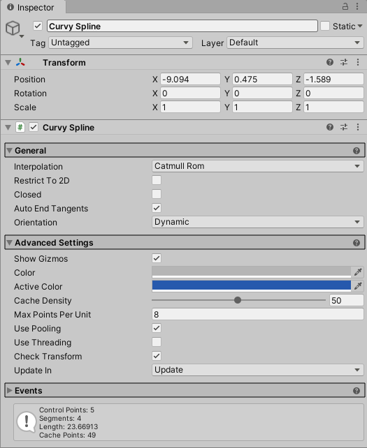 5)스플라인 오브젝트에 curvy spline 컴포넌트가 추가되어있는것을 확인할수있다.