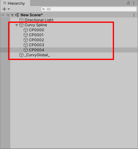 4)hierarchy에서 스플라인 오브젝트(curvy spline)를 확인할수있다. 스플라인 오브젝트는 자식오브젝트로 포인트를(CP, curvy spline segment) 가지고있다.