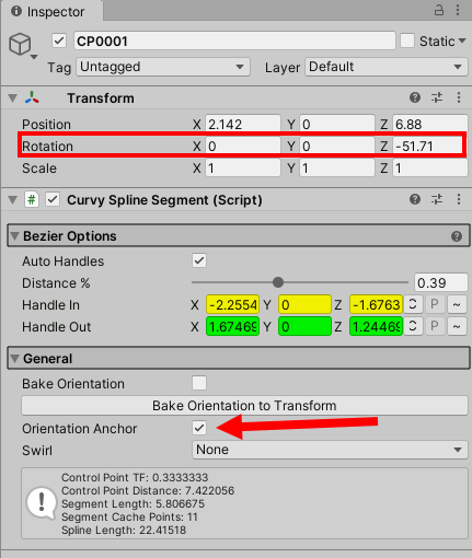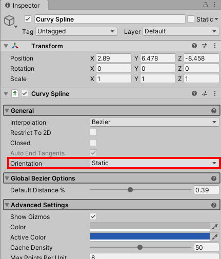static는 기본적으로 스플라인을 이루는 모든 포인트의 회전값(rotation)을 변경하여 오리엔테이션을 설정한다.