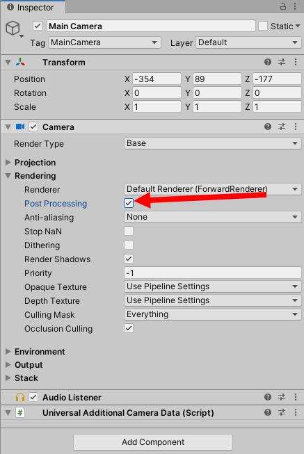 9)포스트프로세싱을 사용할 카메라를 선택하고 rendering의 post processing에 체크한다.