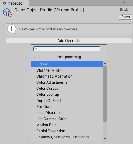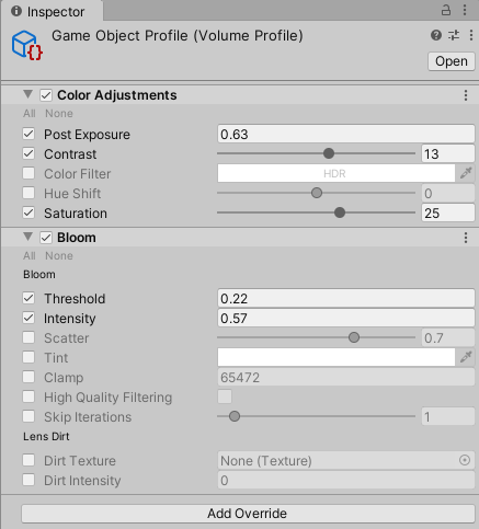URP는 자체통합 포스트프로세싱을 제공한다. 씬에 볼륨을 추가하고 카메라에서 post processing을 활성화하여 단순한방법으로 사용할수있다.