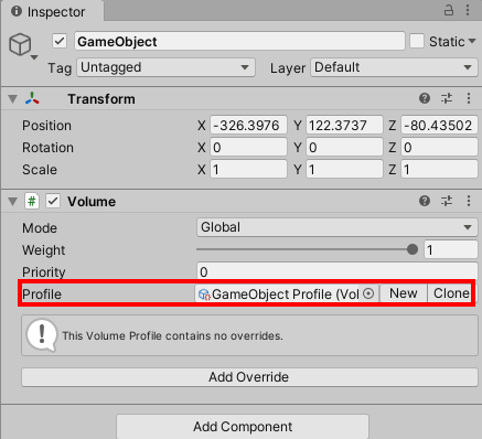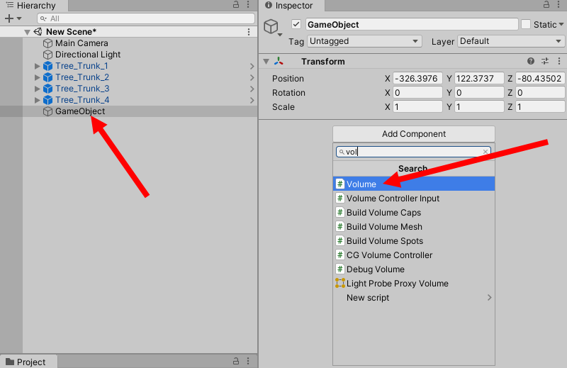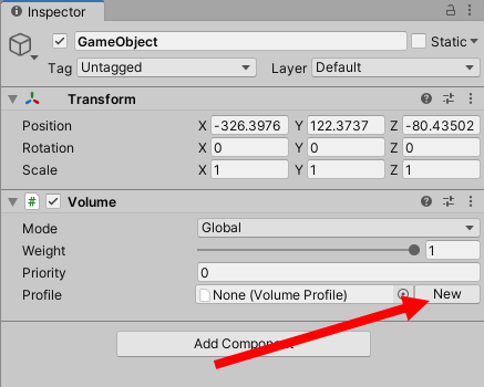 2)씬에 게임오브젝트를 생성하고 volume 컴포넌트를 추가한다.