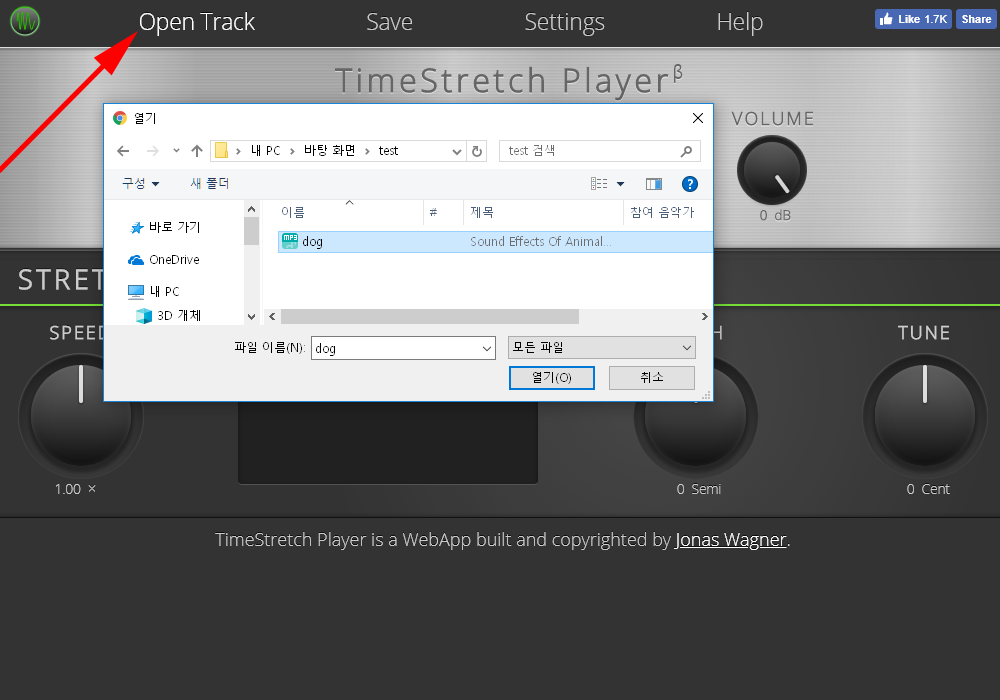 1)위 홈페이지로 이동해서 상단의 open track을 클릭하고 오디오파일을 불러오기한다.