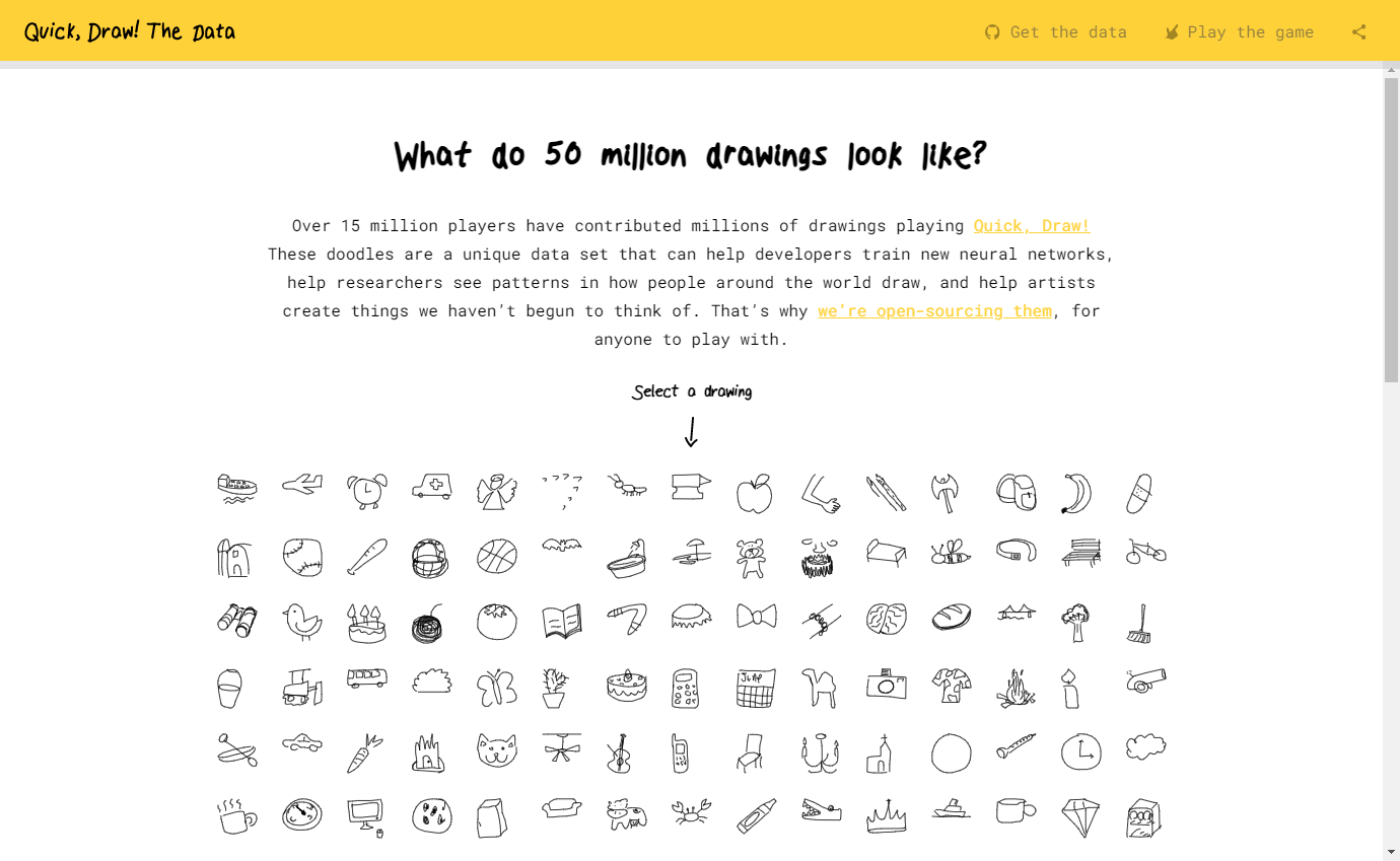 전세계 이용자들이 드로잉 놀이에 참여하여 제공한 낙서 데이터세트로 개발자들에게 유용한 정보를 제공하고 사람들이 그림을 그리는 패턴을 알수있게해준다.