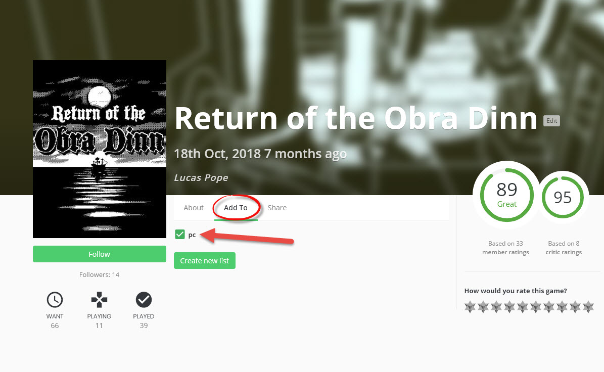 6)검색한 게임의 add to에서 추가할 리스트에 체크하면 게임을 리스트에 추가한다.