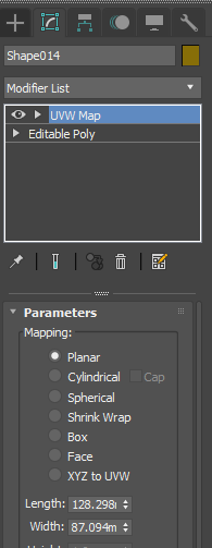2)오브젝트에 UVW Map을 추가한다. planar 방법으로 맵핑하고 gizmo의 크기를 조절한다.