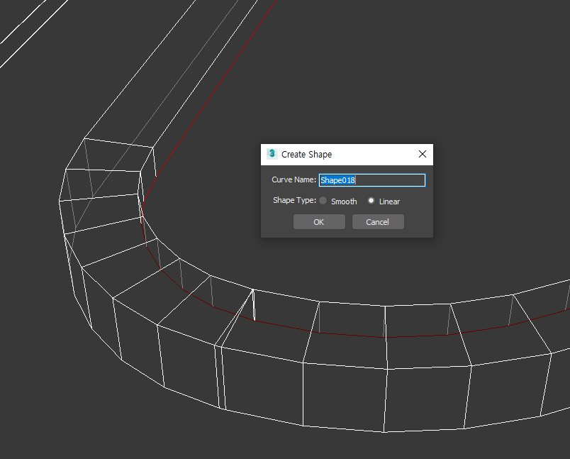 5)create shape from selection을 클릭하면 선택한 edge의 spline 오브젝트를 생성한다.