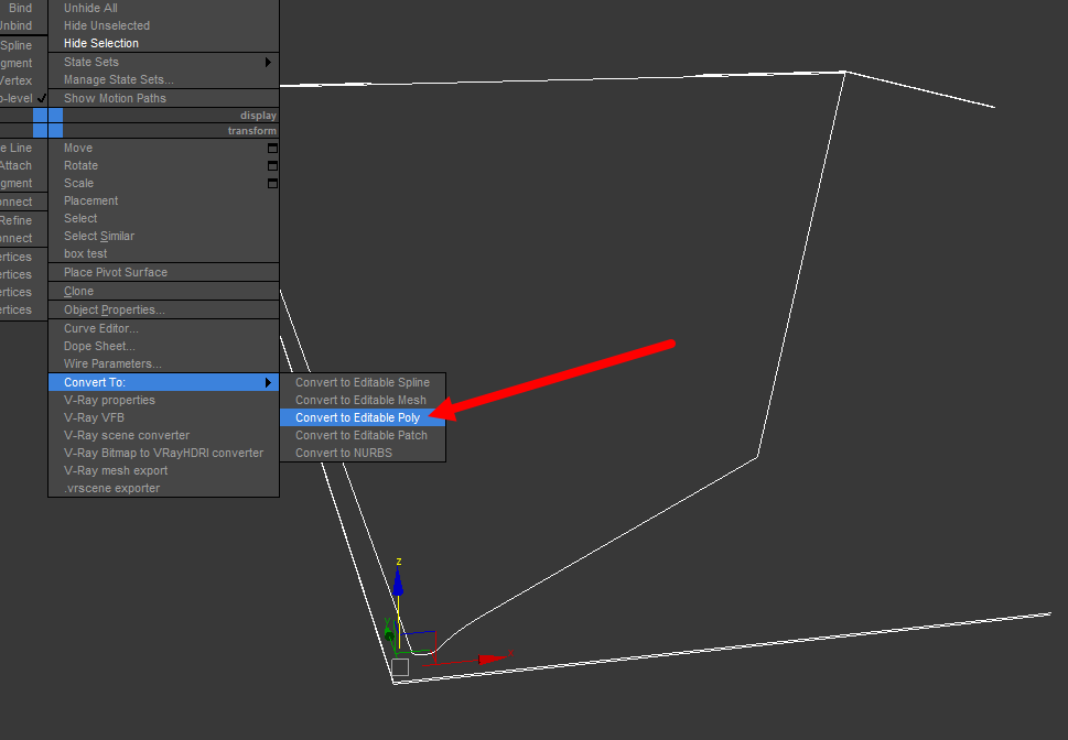 9)스플라인 오브젝트를 폴리곤 오브젝트로 변환한다(마우스 우클릭한후 convert to editable poly를 선택)