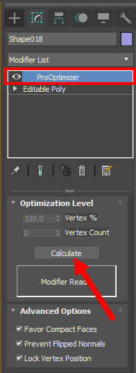 10)폴리곤 오브젝트에 pro optimizer를 추가하고 caculate를 클릭한다.