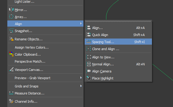 3)가로등 오브젝트를 선택하고 상단의 tools 메뉴에서 align의 spacing tool을 선택한다.
