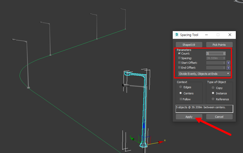 spacing tool의 parameters를 조절하여 오브젝트를 정렬하고 최종적으로 apply를 클릭한다.