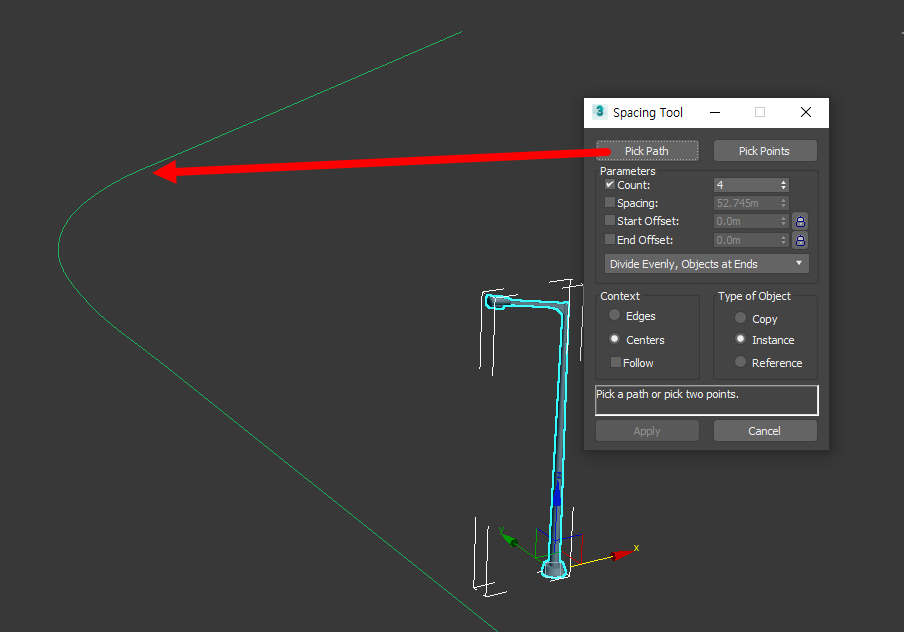 4)pick path를 선택하고 씬의 스플라인 오브젝트(path)를 클릭한다.