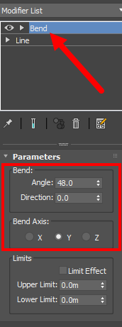 10)bend를 추가하고 angle 수치를 조절하여 오브젝트를 구부린다.