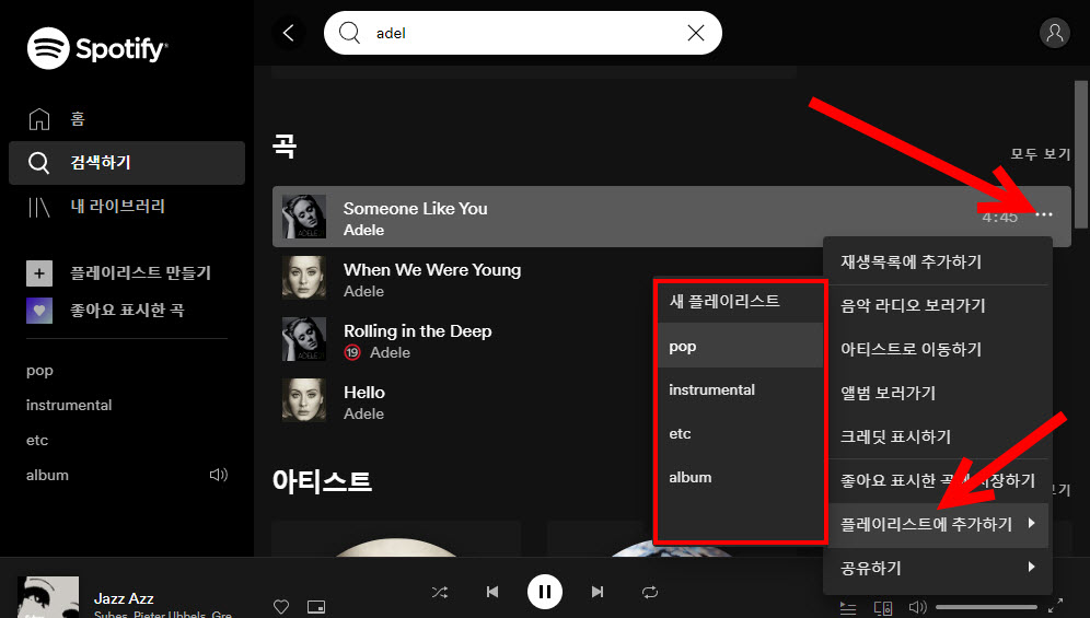 11)곡을 선택한후 우측의 아이콘을 클릭하고 플레이리스트에 추가하기에서 리스트를 선택한다.