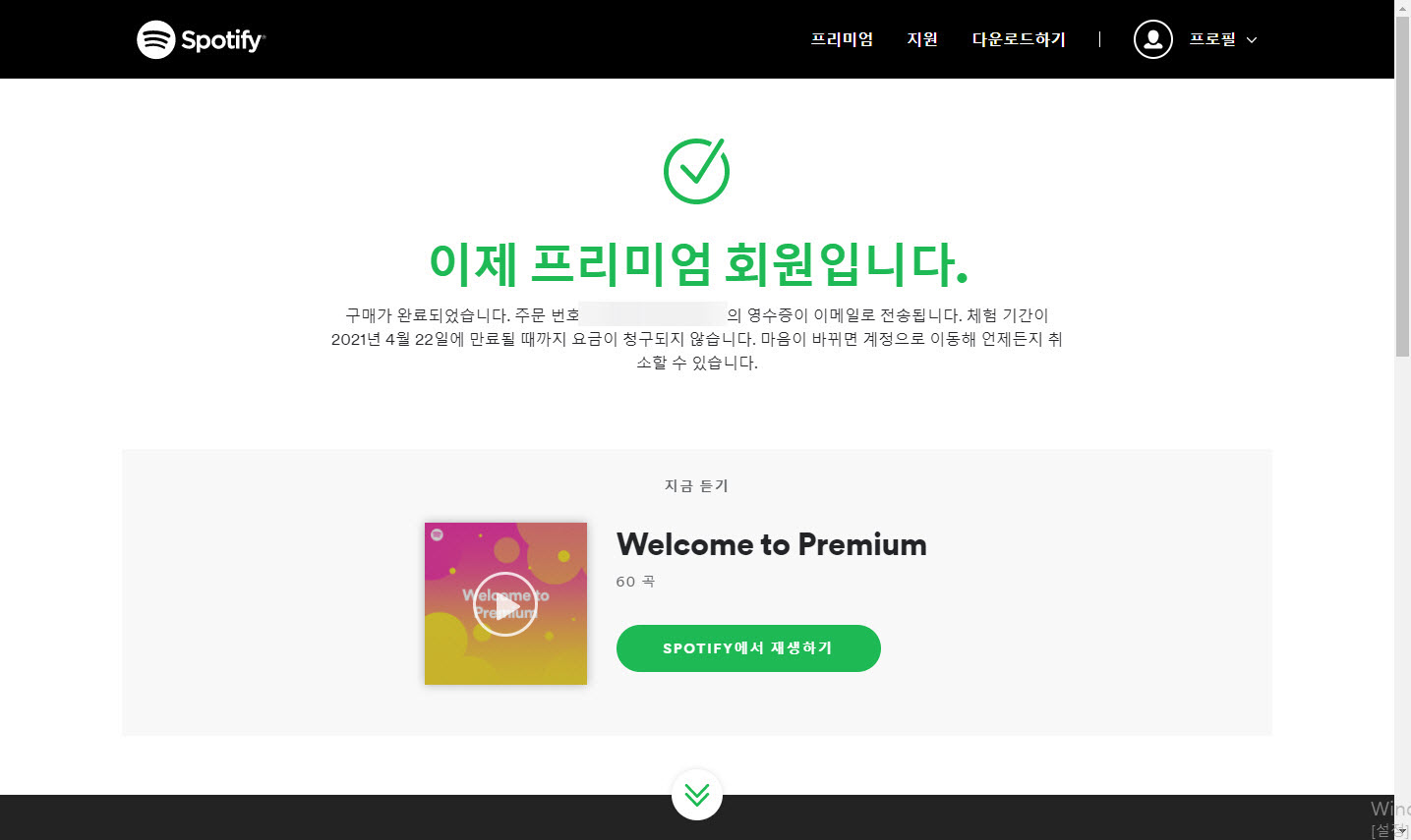 6)가입 및 결제를 완료하면 프리미엄 회원으로 스포티파이 서비스를 이용 가능하다.