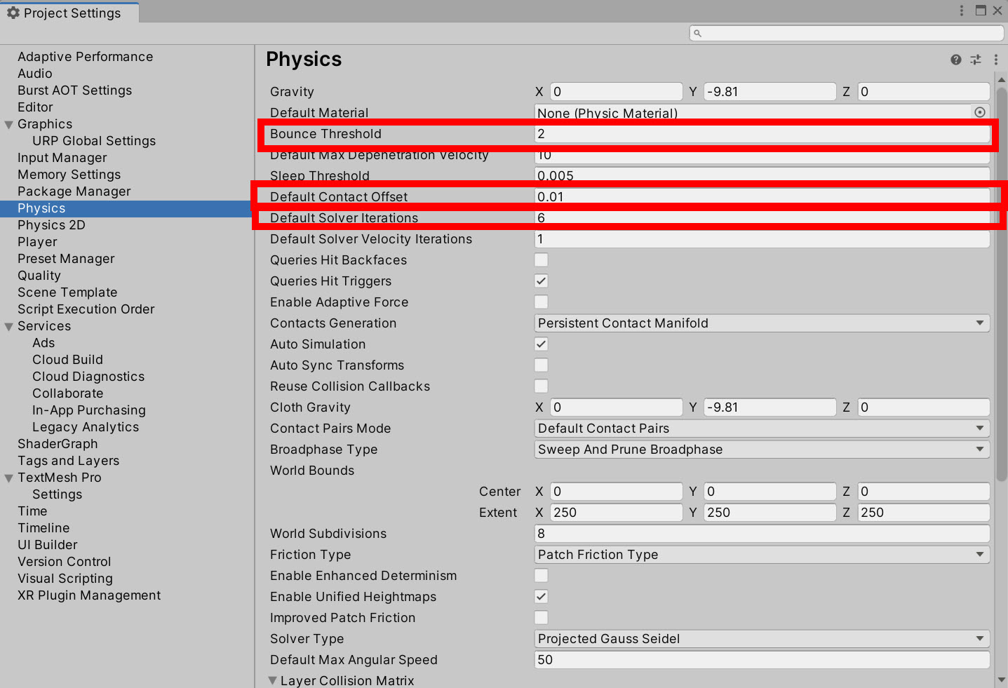 유니티(Unity)에서 충돌 jitter를 개선하기 위한 물리 속성(physics)