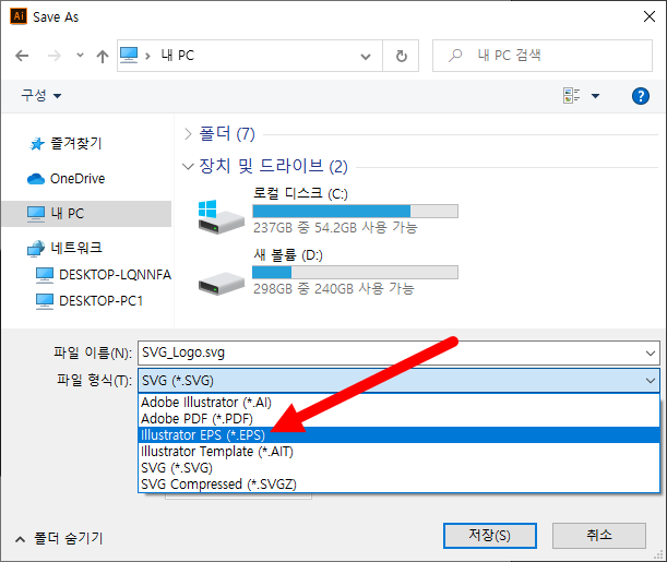 5)파일 형식에서 .EPS(illustrator EPS)를 선택하고 저장한다.