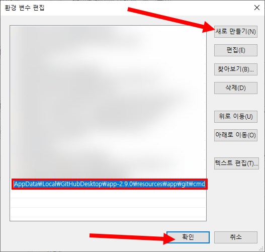 10)새로 만들기에서 git.exe 파일이 위치한 경로를 추가하고 확인한다.
