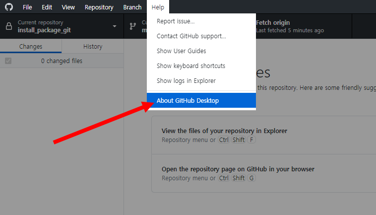 2)깃허브데스크톱의 상단 help 메뉴에서 about github desktop으로 이동한다.