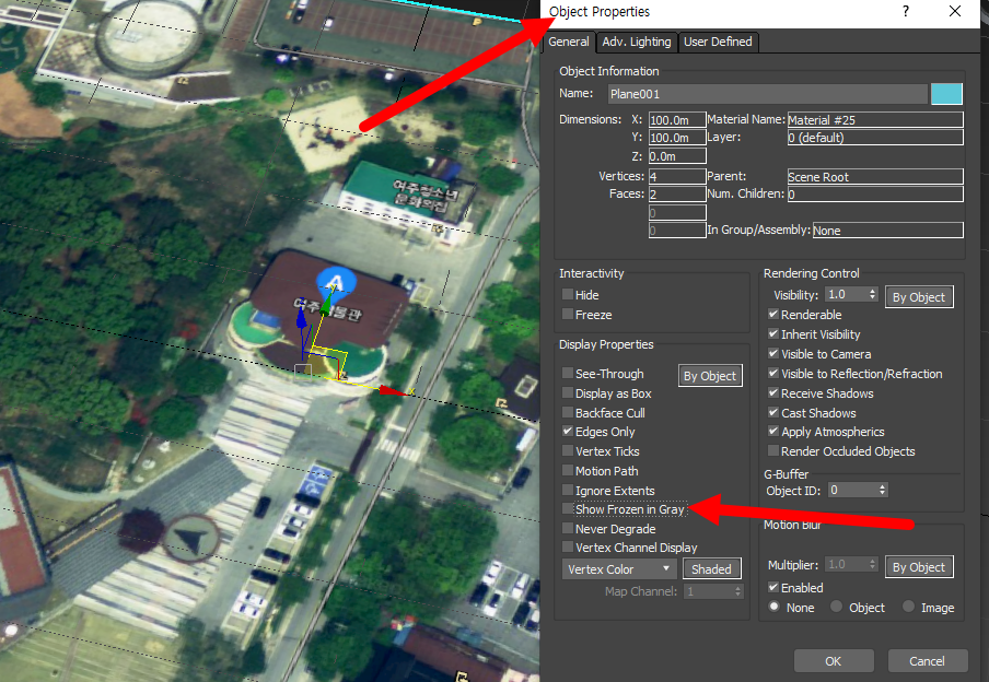 13)plane오브젝트에 위성사진 이미지를 맵핑하였으며 씬에서 선택이 불가능하도록 설정하였다(freeze selection)