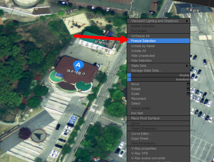 12)plane 오브젝트를 선택하고 마우스 우클릭한후 freeze selection을 선택한다.