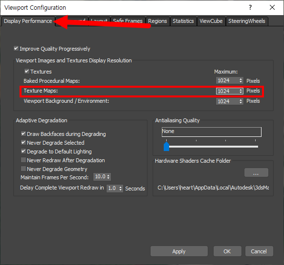 7)display performance 탭에서 texture maps의 해상도를 설정한다. 예에서 1024 pixels로 설정하였다.