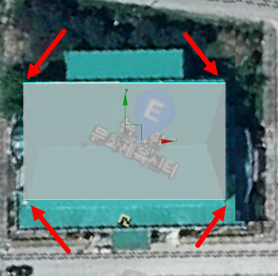 4)위성사진에서 건물의 외곽을 확인하고 editable poly의 정점 위치를 수정한다.