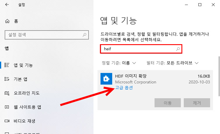 3)앱 및 기능에서 초기화하려는 앱을 검색한다. 윈도우10 기본앱의 경우 추가적으로 고급 옵션이 표시된다. 고급 옵션으로 이동한다.
