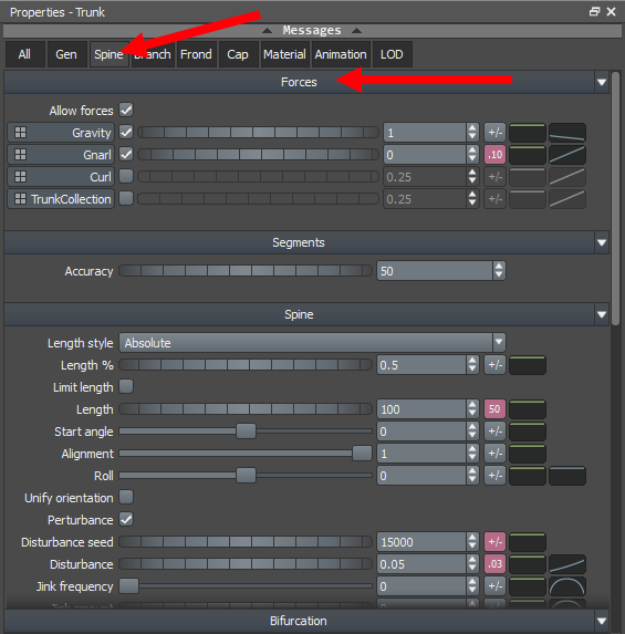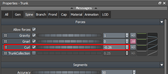 3)curl 항목에 체크하고 수치를 조절하면 나무를 구부린다.