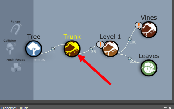 1)나무의 몸통인 trunk 노드를 선택한다.