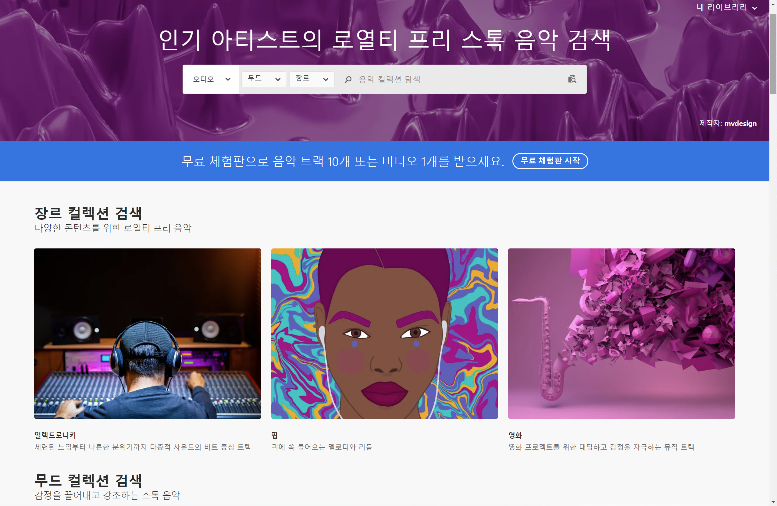 어도비(adobe)에서 제공하는 상용 음악 및 효과음을 구매할 수 있는 플랫폼으로 Adobe Creative Cloud 사용자에게 통합된 환경을 제공합니다.