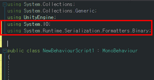4)BinaryFormatter 클래스를 사용하기위해 네임스페이스를 추가한다.