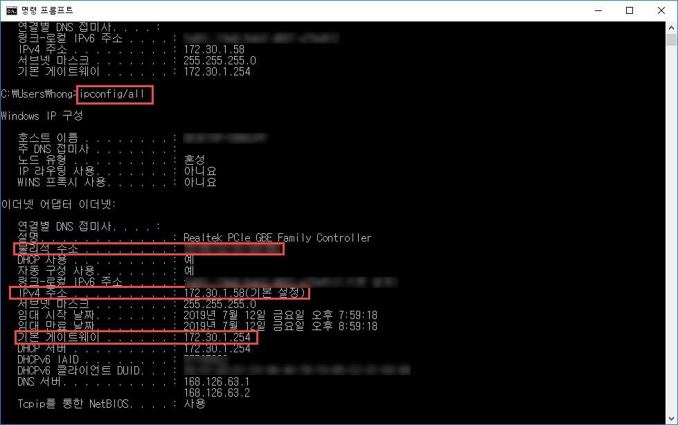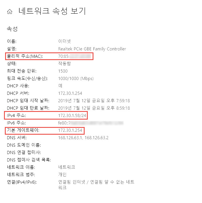 내 컴퓨터 아이피주소, 맥주소 확인하기