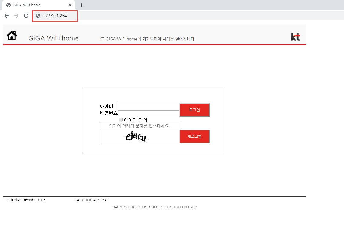 사용자 id와 비밀번호를 입력하고 로그인한다. 만약 이전에 사용자id, 비밀번호를 설정한적이 없다면 초기 기본값으로 되어있을것이다. 이부분은 인터넷 서비스 제공업체에 문의하여 확인할수있다.