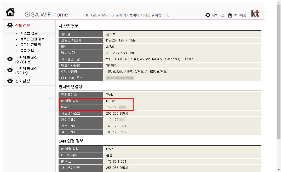 3)사용자 로그인하면 현재 사용중인 공유기의 펌웨어 메뉴에서 시스템, 인터넷 연결, lan연결등에 대한 정보를 확인할수있다. 여기에서 인터넷 연결정보의 ip주소가 현재 인터넷에 연결된 단말기(데스크탑)의 아이피주소이다. 정확히 DHCP로 할당받은 동적 아이피주소이다.