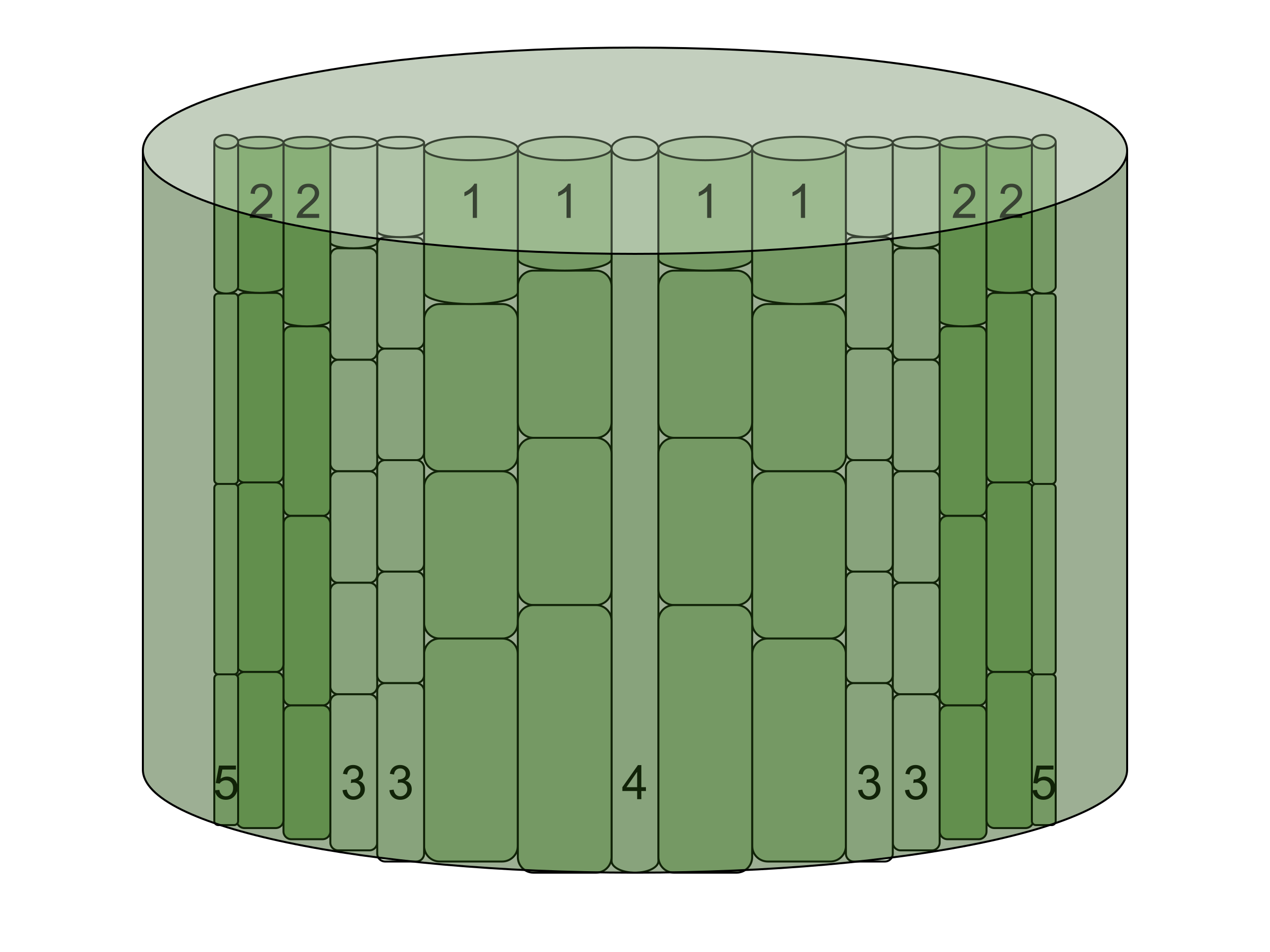 줄기와 뿌리의 성장층으로 나무가 두꺼워지는 데 기여. 아래 이미지에서 3번