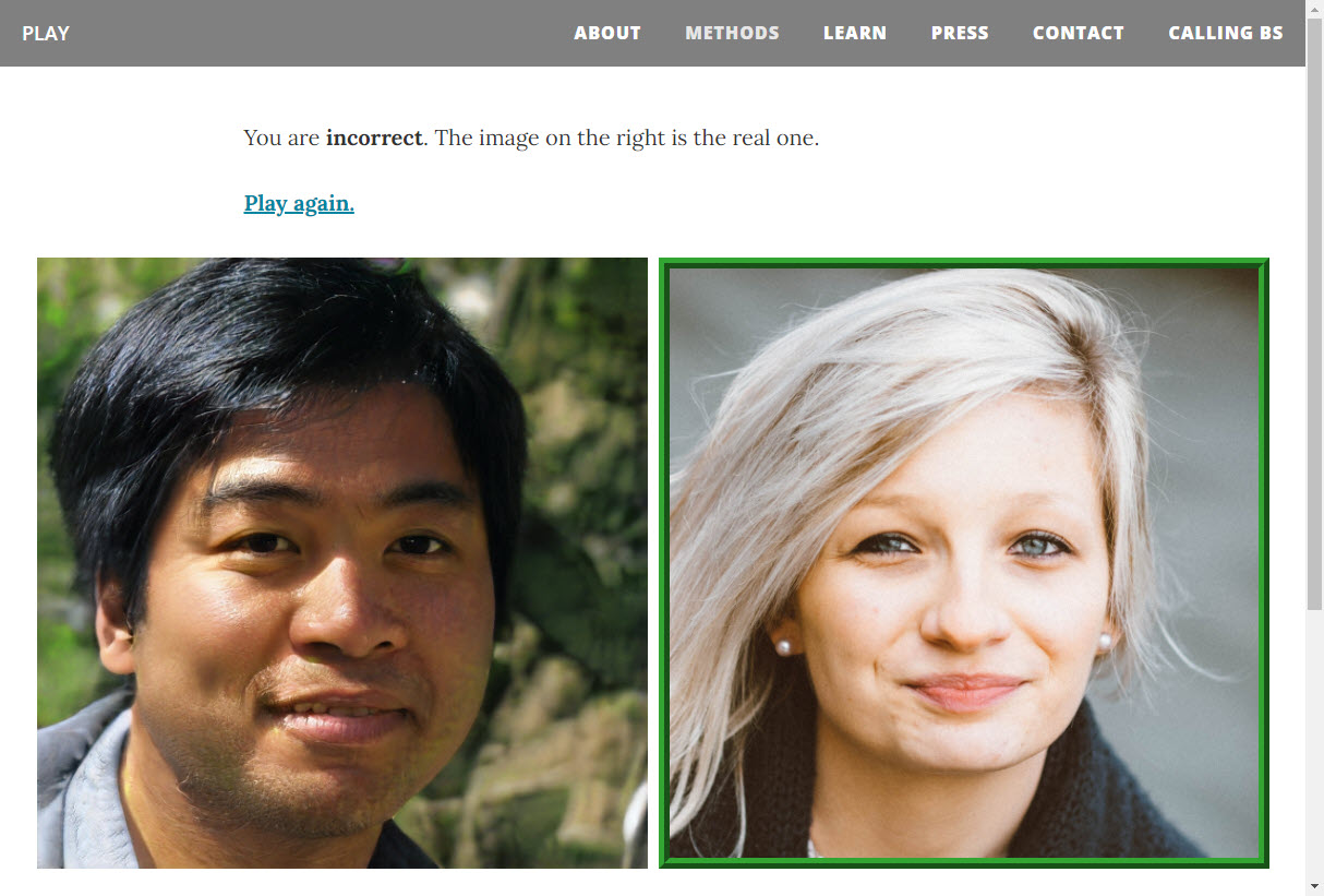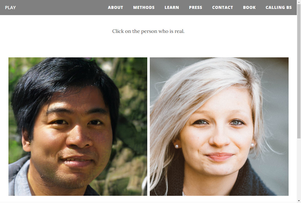 웹사이트에 접속한 이용자는 무작위로 제시하는 두장의 얼굴 이미지 중에서 가짜 이미지와 실제 사진을 판별해야한다. 워싱턴 대학의 Jevin West 와 Carl Bergstrom이 Calling Bullshit 프로젝트의 일환으로 제작한 웹사이트로 사이트에서 사용된 가짜 이미지는 StyleGAN 소프트웨어를 사용하여 생성되었고 실제사진은 FFHQ 데이터 세트를 이용하였다.