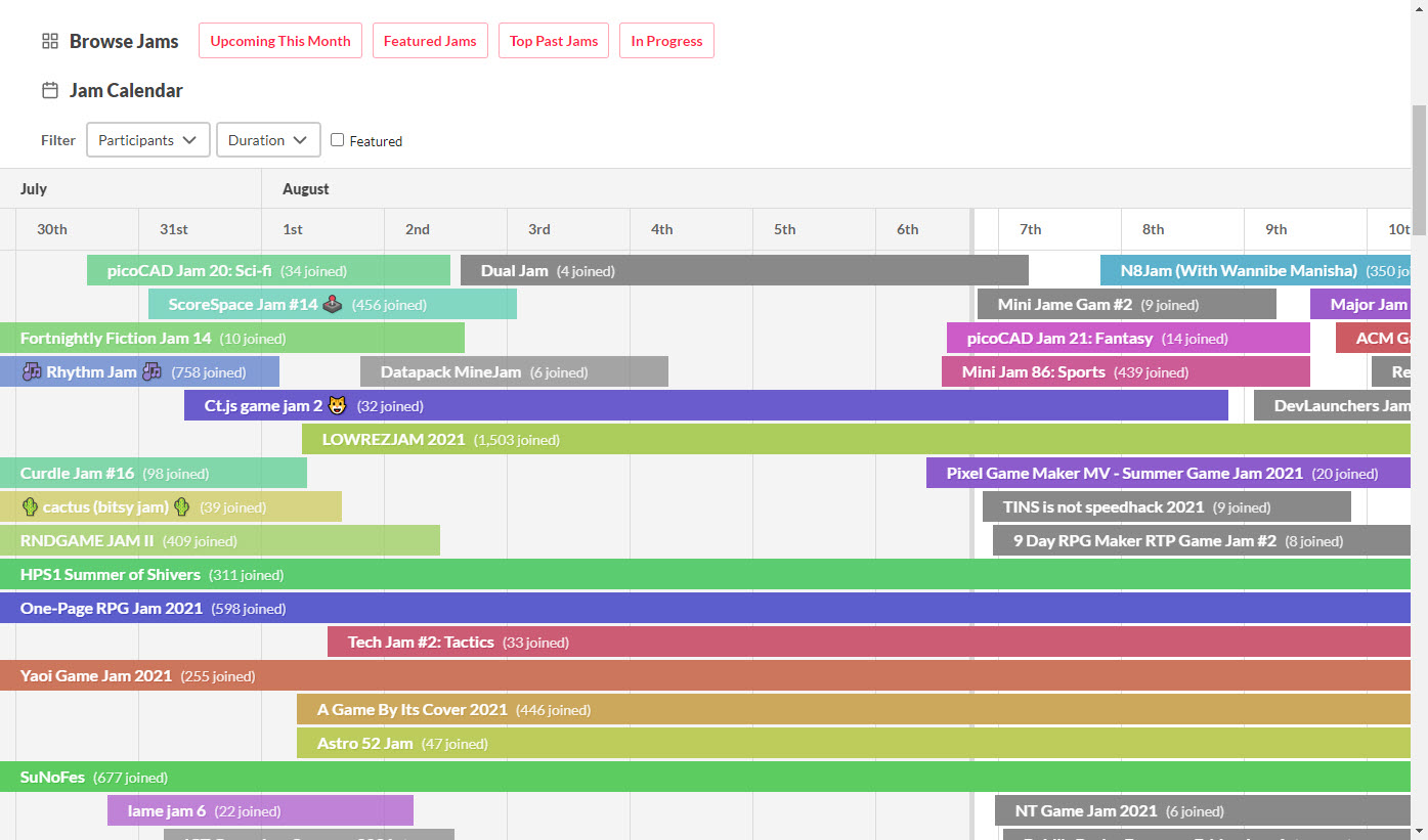 itch.io에서는 참가자들이 제한된 시간내에 게임을 만드는 콘테스트인 게임잼(game jam)을 주최한다. 개인 및 팀은 잼을 호스팅하고 참여할수있다.