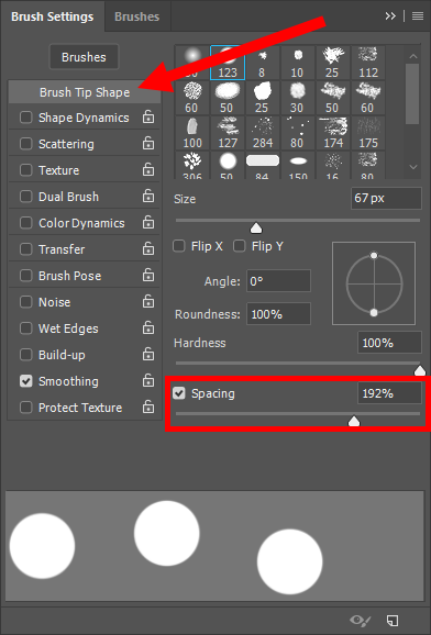 11)brush settings 패널에서 brush tip shape의 spacing 수치를 높인다.