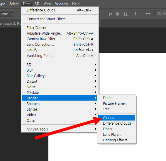 3)filter 메뉴에서 render의 clouds를 선택한다.