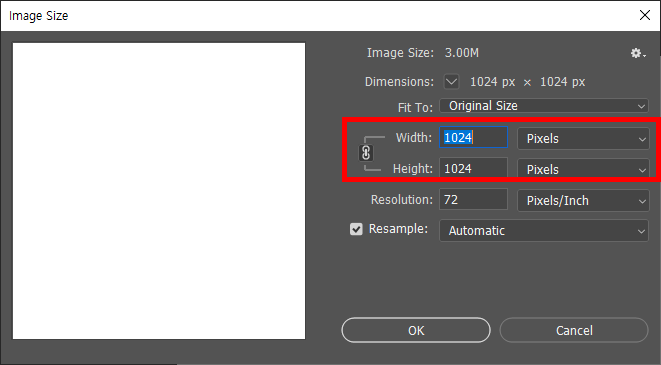 1)포토샵에서 새로운 document를 생성한다. 예에서 1024x1024 사이즈(pixels)의 이미지를 생성하였다.