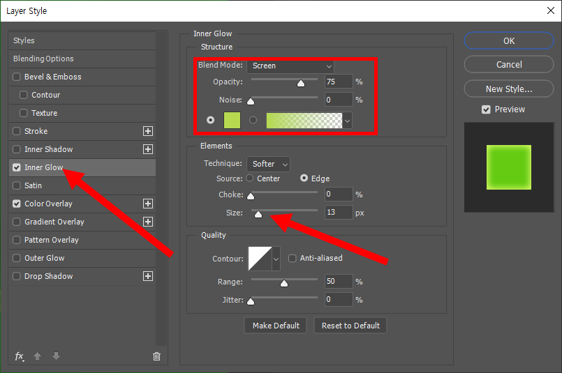 15)inner glow를 추가하고 blend mode, color, size등을 설정한다.