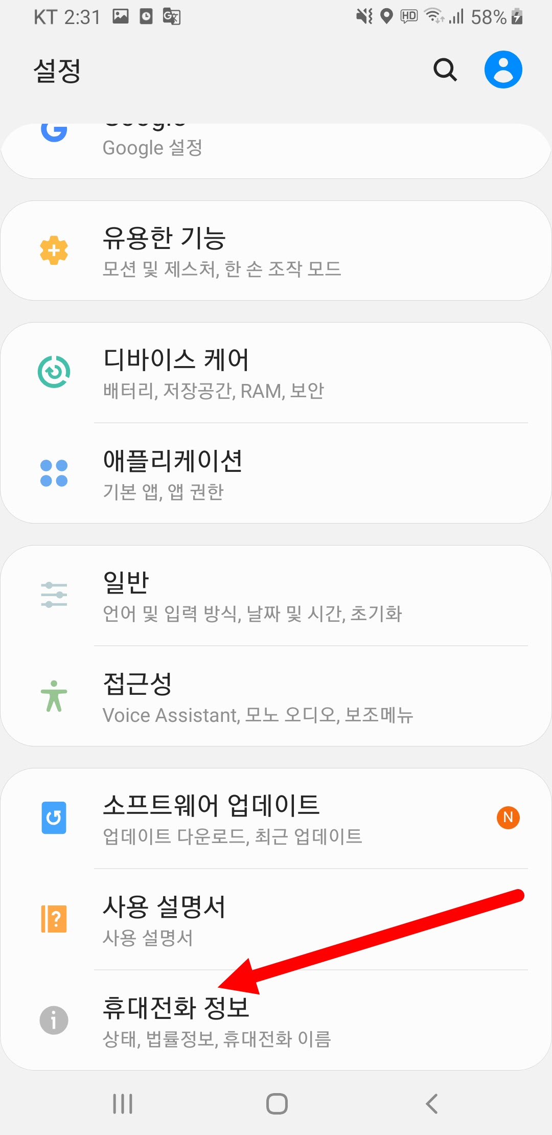 2)설정에서 휴대전화 정보로 이동한다.