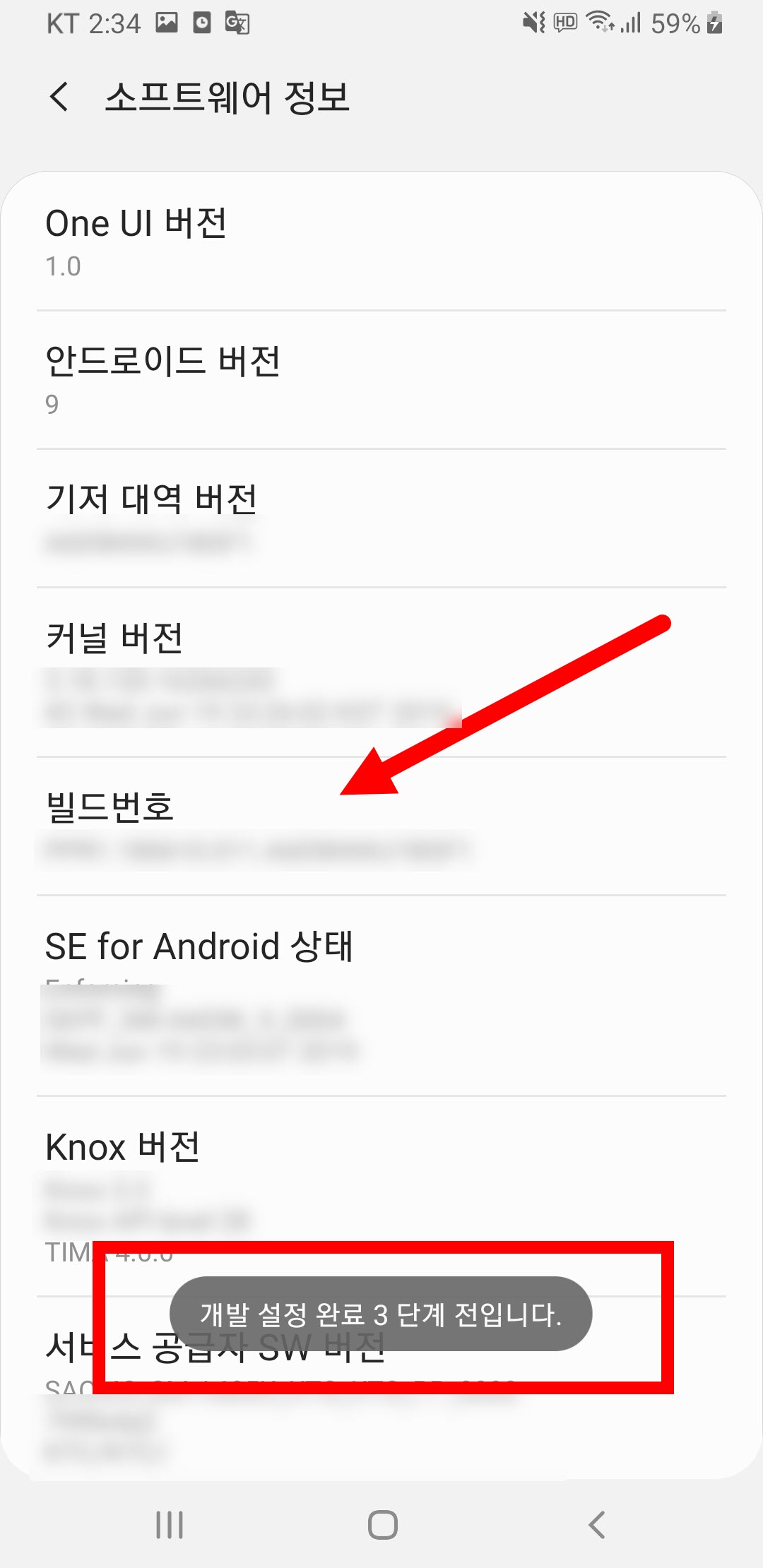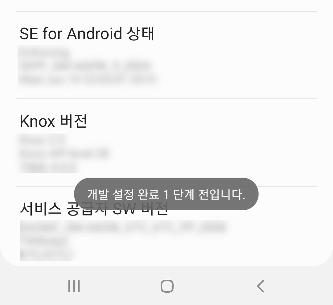 4)빌드번호 항목을 탭하면 장치의 스크린 하단에 아래 문구가 표시됩니다.