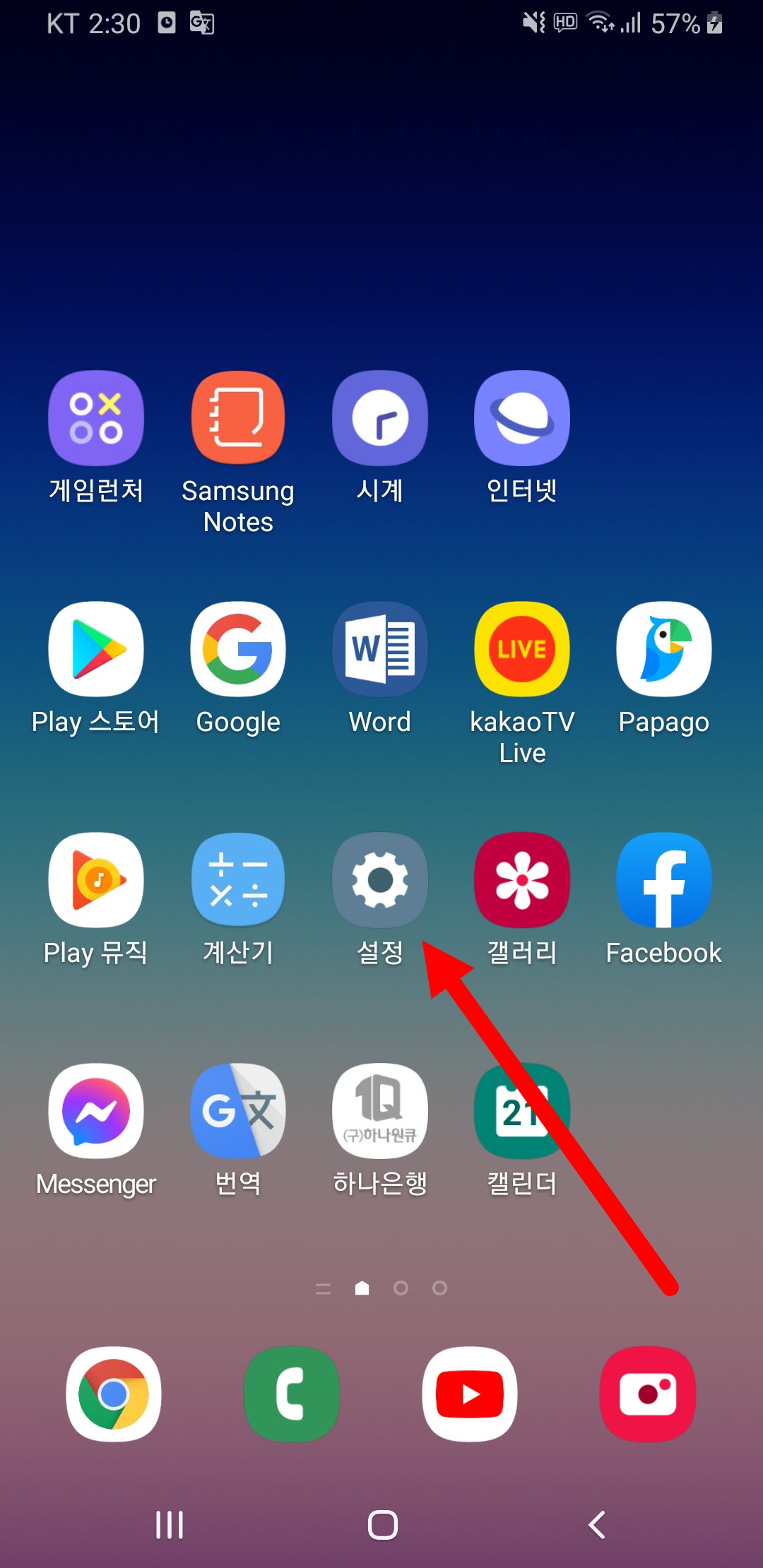 1)갤럭시 초기화면에서 설정으로 이동합니다.