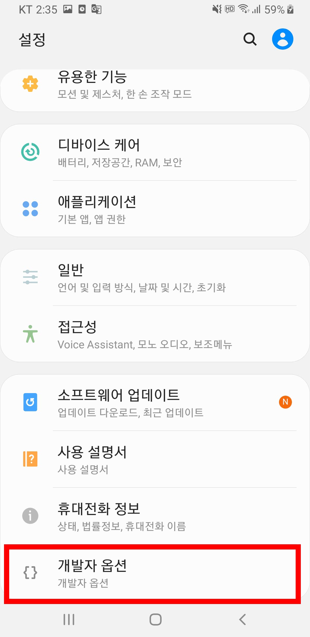 초기 설정 메뉴로 이동하면 휴대전화 정보 메뉴 하단에 개발자 옵션 메뉴가 표시된것을 확인할수있습니다.